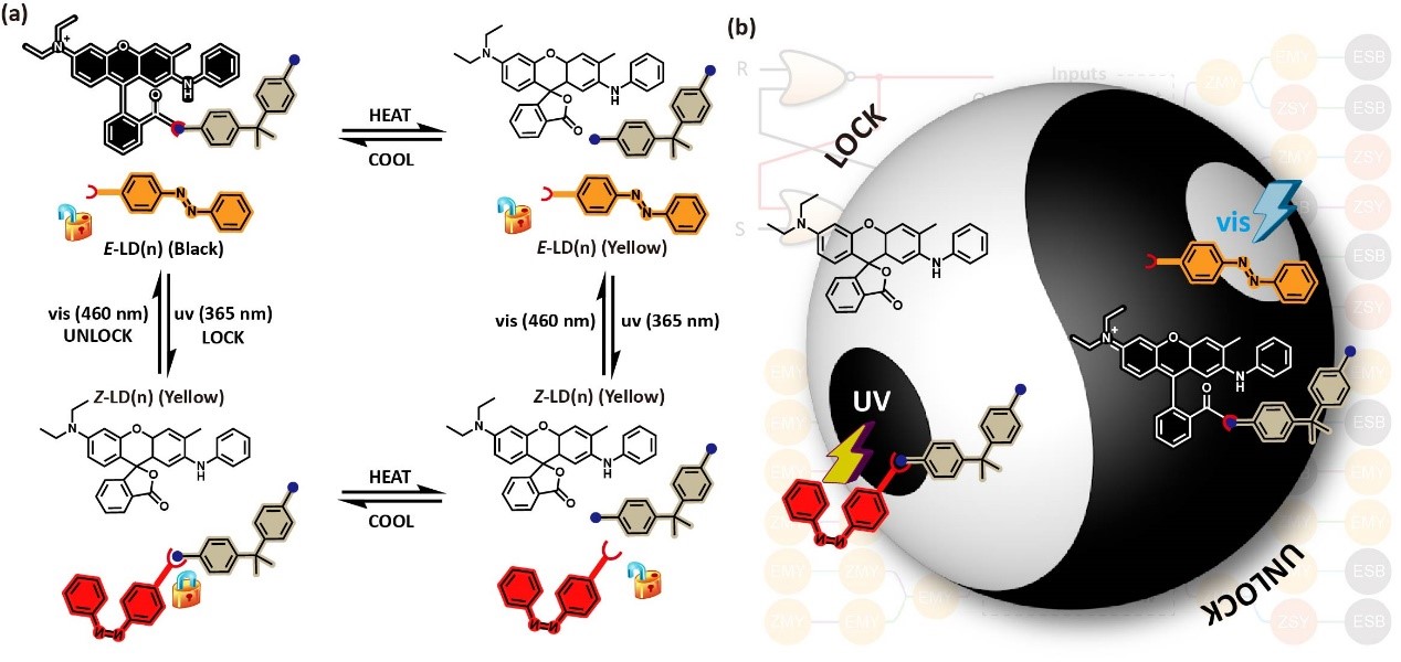 三组份温致变色染料是由隐色体染料、显色剂以及溶剂构成的温致变色响应材料,其因色谱广、温变颜色对比度高、循环性好受到广泛的关注以及研究。王潮霞教授团队首次将偶氮苯光响应分子引入三组份温致变色体系,通过偶氮光异构特性光控开关温致变色功能。本文通过实验与理论计算结合的手段,阐明了温致变色过程光控制的内在机理,也为后续在多输入分子逻辑应用、广光谱开发以及太阳能存储等领域奠定基础。