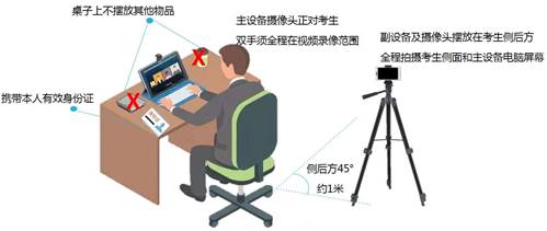 副设备须摆放在考生侧后方(与考生后背面成45°角),能够全程拍摄考生本人和主设备电脑屏幕,面试全程开启。副设备须关闭麦克风权限并保持静音状态。