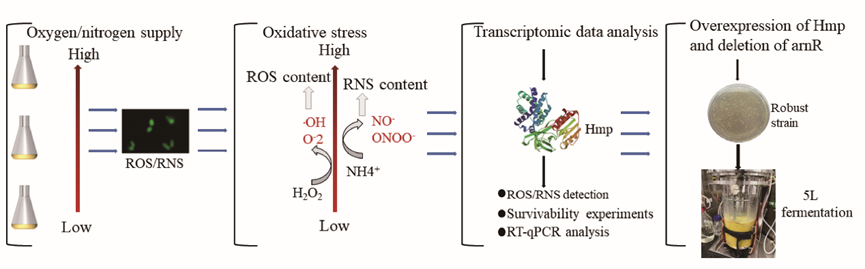 谷氨酸棒杆菌是一种重要的工业菌株,常用于在高溶解氧和高氮源下生产关键氨基酸和有机酸,但在发酵后期会产生大量对细胞有毒性的活性氧(ROS)和活性氮(RNS)对细菌造成氧化应激损伤。因此,需要构建具有抗氧化能力的细胞来增强工业菌株的鲁棒性提高各种氨基酸和有机酸的生产效率。Hmp黄素血红蛋白作为一个依赖氧气的NO双氧酶(NOD),将NO-和O2转化为惰性的硝酸盐,并通过依赖黄素的还原反应催化再生,与微生物的氧化还原过程相关,它能保护细胞免受氧化压力。