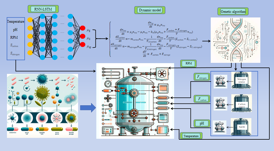 丁健团队以地衣芽孢杆菌BF-002发酵过程为研究对象,在深入研究和了解地衣芽孢杆菌发酵过程工艺机理和主要影响条件的基础上,设置多批发酵实验扩充数据集,以发酵动力学为基础,结合地衣芽孢杆菌发酵过程的自身特点,建立地衣芽孢杆菌补料分批发酵动力学模型,后利用差分进化算法对模型中的未知参数进行拟合,通过数据分析认识到动力学模型之中的不足和预测误差来源后,将动力学模型与人工神经网络相结合构建了混合模型,利用RNN-LSTM来拟合模型中的μsp、μg和μd,使这三个参数可随环境和时间变化而动态调节,后通过实验数据验证模型预测性能,结果显示混合模型的预测精度得到提高。本课题利用遗传算法对构建的混合模型进行优化,并进行了数据仿真,后利用所得到的最佳工艺操作曲线进行实验,结果发现与仿真结果大致相同。与对照批次相比,2个最优批次的nf,sp分别提高16.20%和35.21%。最优批次不仅降低了成本,而且使芽孢产量得到了大幅提升,证明利用遗传算法优化构建的地衣芽孢杆菌发酵混合模型所得到的工艺操作曲线具有指导意义,可显著提高培养B.licheniformisBF-002的经济效益。