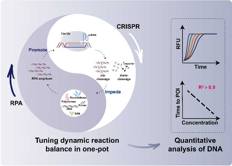近年来,CRISPR/Cas系统已成为一个突出的多功能核酸诊断工具,但面临着检测灵敏度较低的问题。尽管结合预扩增反应的CRISPR/Cas检测方法能够提高灵敏度,但两步反应操作复杂,存在交叉污染风险。因此,吴群教授等人提出利用一锅CRISPR/Cas12a-RPA系统对微生物进行精准定量的策略,基于RPA扩增与CRISPR/Cas12a切割的多系统动态反应平衡控制,建立了一种新型的微生物定量检测技术,命名为OICRQ。该技术操作简便(仅需37℃反应),效率高(检测时间小于1小时)、灵敏度高(最低10copies/反应)、分辨率高(实现种水平的定量)、准确性高(P>0.05)、普适性强(可用于细菌、真菌、病毒等各种微生物的定量)。例如,该技术可用于食品发酵体系耐酸乳杆菌(Lactobacillus acetotolerans)的定量(定量范围:10~107copies/reaction),也可用于SARS-CoV-2的定量(定量范围:1.38 × 102至1.38 × 107copies/reaction),可实现多个真实样品中的靶标微生物(包括发酵食品样品中L.acetotolerans及临床样品中SARS-CoV-2)的精准定量分析。该技术不依赖于复杂的热循环仪器的要求,可作为qPCR的竞争替代技术。本研究为新型微生物精准定量技术打开了一扇新的大门,在医疗诊断、食品生产以及环境体系中精准定量检测细菌、真菌和病毒具有巨大潜力。