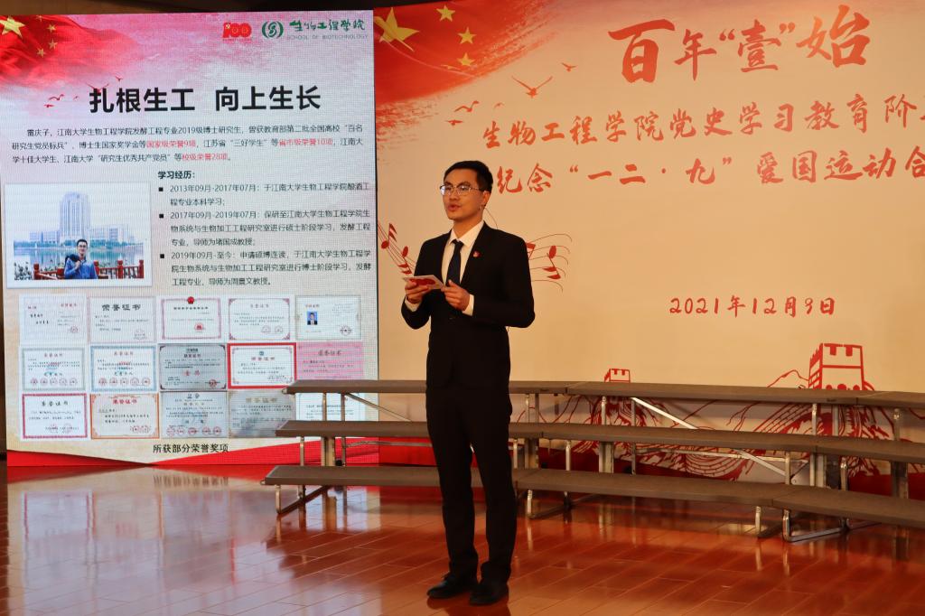 主讲人从“学、信、行”三个篇章回顾了学院一年来通过“固圈”“扩圈”“破圈”,深入历史现场,坚持学思践悟,将党史学习教育的成果落实在“我为师生办实事”上,入脑入心、走深走实,汲取党史智慧、砥砺初心使命。随后,在场观众共同观看“筑精神谱系,扬精神血脉”百名学生党员走访百名老党员视频展。全国高校“百名研究生党员标兵”雷庆子、酿造微生物学与应用酶学研究室学生党支部成员杨诗琪、“百年大党正年轻”宣讲团团长张海云分享党史学习与实践感悟,呼吁青年学生要坚定理想信念、夯实学科自信,肩负时代使命,为实现伟大复兴的中国梦而不懈奋斗。