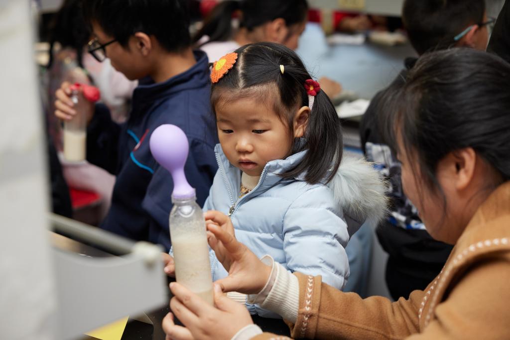 随后,在生物工程学院实验教学平台、食品发酵国家级实验教学示范中心,生工2101团支部同学为小朋友们精心设计了“洋葱表皮细胞质壁分离”和“酵母吹气球”两个实验。“质壁分离”实验中,在显微镜下观察到滴加蔗糖溶液的洋葱紫色的原生质体从与细胞壁紧密贴合,再与细胞壁分离开并逐渐变小,颜色逐渐加深。而在“酵母吹气球”实验中,气球在酵母的“努力”下逐渐膨胀变大。两个小实验充分激起了小朋友们对微观生物世界的兴趣,感受到生命科学的奇妙。