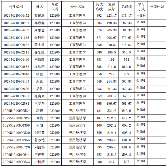 根据考生复试情况及综合成绩排名,现公布我院建议录取名单,名单可能因学校下达招生名额、考生自动放弃等情况发生变更,请及时关注。实际录取名单以学校研究生招生工作领导小组审核通过、研究生院公示拟录取名单无异议、教育部最终审定为准。
