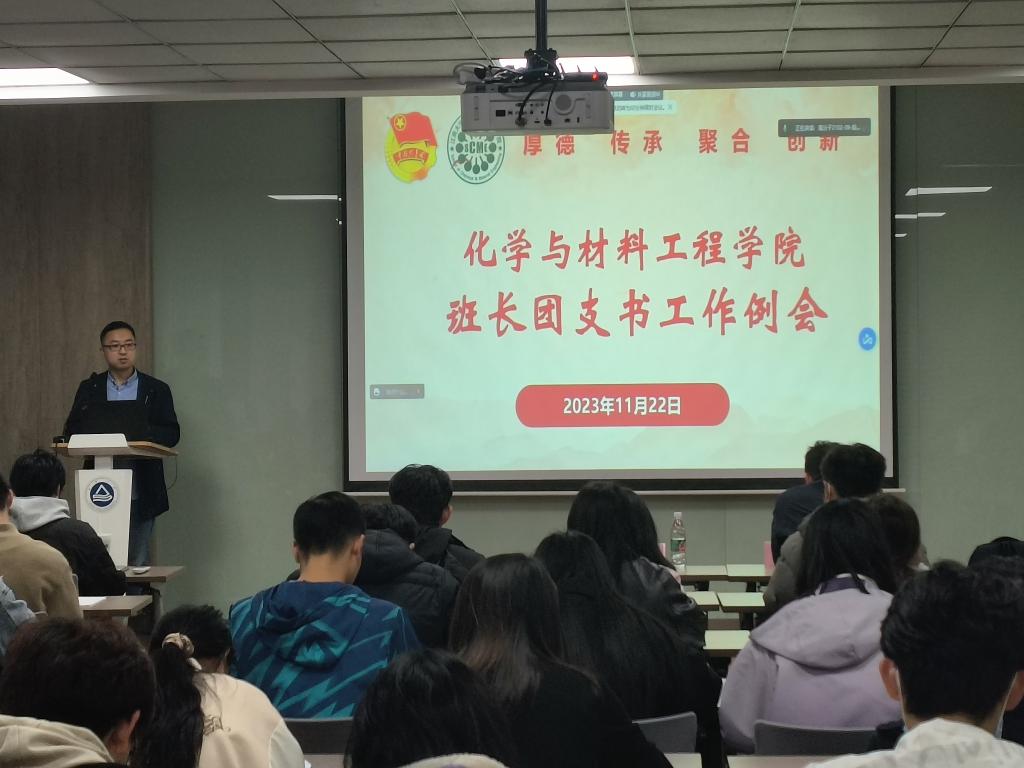 为深入学习贯彻习近平新时代中国特色社会主义思想,进一步提升我院基层团学干部的理论素养和实践能力,化学与材料工程学院于11月22日召开班长团支书工作例会。会议设置蠡湖和东氿两个会场,马克思主义学院专任教师巩建青、学院分团委书记鞠峰、各班级班长、团支书及分团委部门负责人参加会议,会议由鞠峰主持。