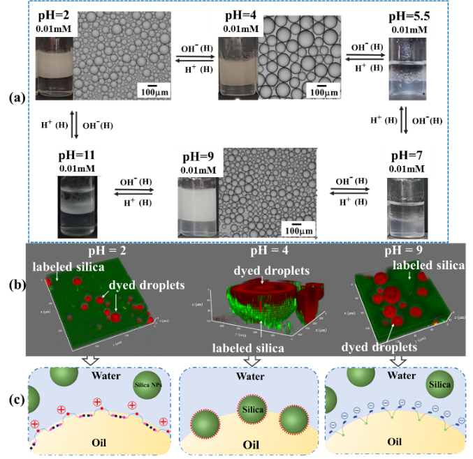 图2 (a) 0.1 wt.% SiO2颗粒与0.01 mM di-UAPAc协同稳定的乳状液随pH变化的智能响应示意图;(b)乳液滴液的3D微观示意图;(c)微观机理示意图. (上述表面活性剂: di-UAPAc, pH ≤ 4; di-UAPAz, 5 ≤ pH < 6; di-UAPAza, 6 < pH ≤ 7; di-UAPAba, pH > 8).