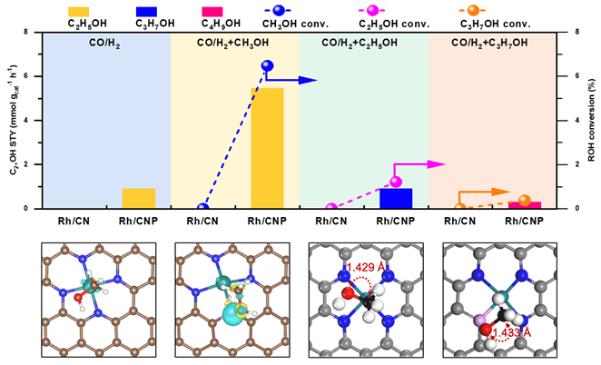实验、表征和理论计算结果表明:(1)Rh-N3P1位点在催化CO2加氢制乙醇的反应中具有优异的催化性能(TOF=420.7 h-1),优于绝大多数文献报道结果。(2)Rh-N4位点对甲醇表现出高选择性(91.3%),通过简单的磷取代(Rh-N3P1)不但大幅增加了反应活性,而且实现了反应产物从甲醇到乙醇(81.8%)的可切换合成。(3)Rh-N3P1位点上优异的CO2反应活性和乙醇选择性可归因于Rh-P位点对的存在,其中P原子对CH3OH*中的O原子表现出强亲和力,P的强给电子能力削弱了C-O键,有利于CH3*的形成以及随后的CH3*和CO*之间的C-C偶联形成乙醇。相比较而言,Rh-N4位点难以有效活化解离C-O键,因此产物以甲醇为主。本工作为CO2加氢高活性、高选择性合成乙醇提出了全新的位对(Site Pair)催化体系,强化了双位点之间的协同催化作用,为指导设计其它高效位点对催化体系,从而解决反应过程中存在的问题提供了新的思路。