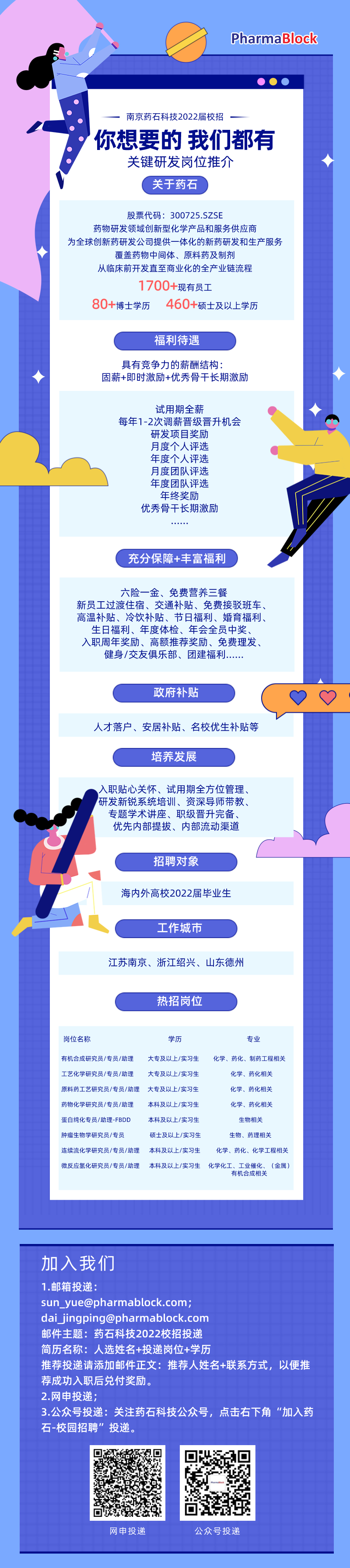 南京药石科技股份有限公司(股票代码:300725,公司简称:药石科技)于2008年开始正式投入运营,是药物研发领域创新型化学产品和服务供应商。主营业务包括药物分子砌块的研发、工艺开发、生产和销售;药物分子砌块下游关键中间体、原料药和制剂的工艺研究、开发和生产服务。同时,整合公司多年来在连续流化学、微填充床技术、催化技术、智能制造等前沿技术上的能力积累,药石科技正在探索生物医药领域绿色、安全和智能化的先进制造及服务模式,促进行业创新发展。