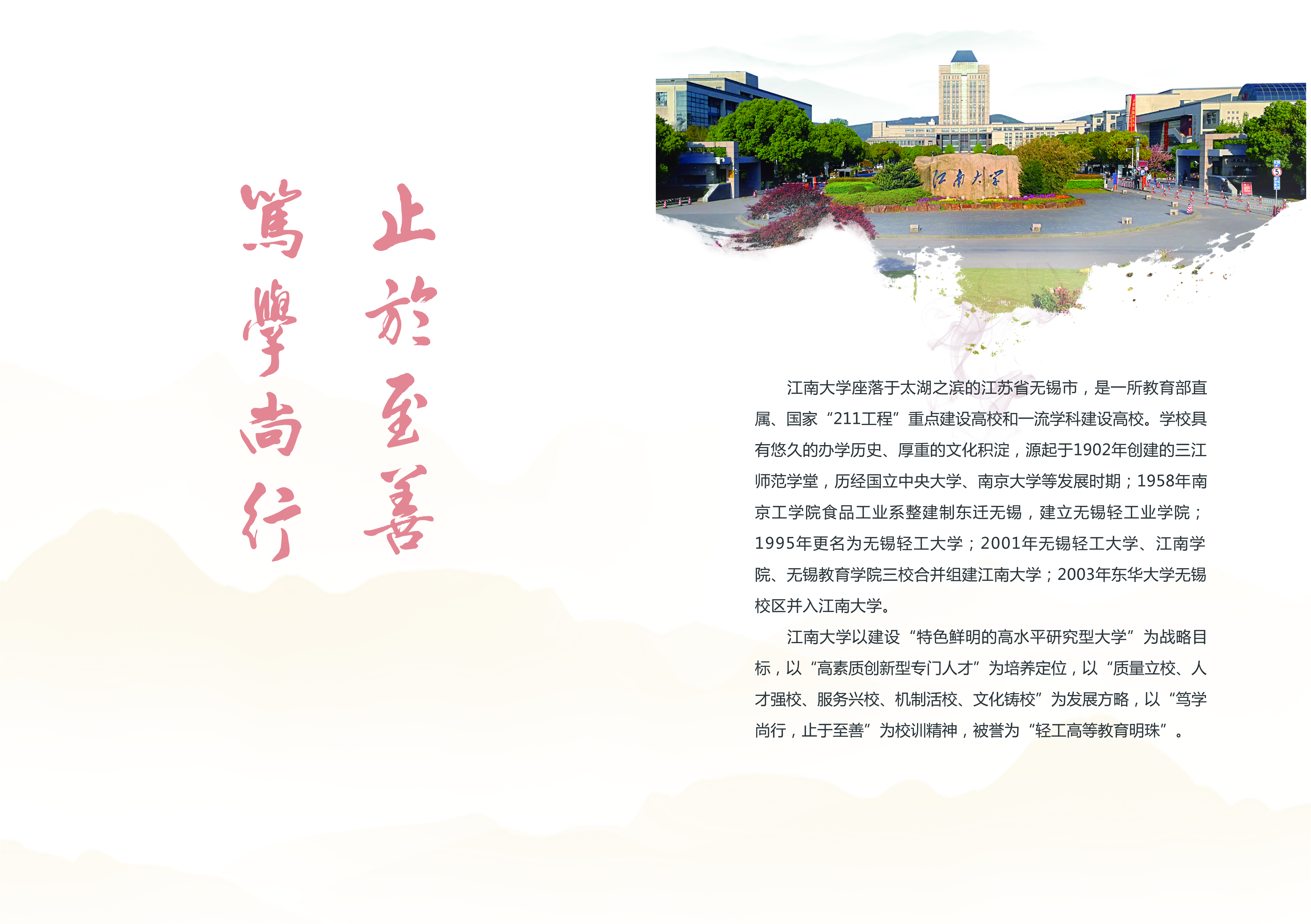 江南大学是教育部直属、国家“211工程”重点建设高校(“九五”首批入选)。学校以“笃学尚行,止于至善”为校训精神;以“彰显轻工特色,服务国计民生;创新培养模式,造就行业中坚”为办学理念;以“建设特色鲜明的研究型大学”为战略目标;被誉为“轻工高等教育明珠”。