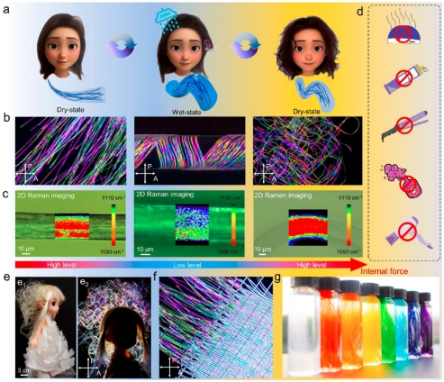 随着生活水平的提高,人们对美的不断追求促进了可穿戴纤维制品的蓬勃发展,其中以假发的市场需求最为广阔。传统假发制备的主要原料常为人发、动物纤维或化学纤维等。但这几种典型纤维或存在产量小、环境依赖性强等问题,或存在不可持续、不环保等问题。另外,目前对假发最主要的的色彩管理手段仍然依赖对健康有害的化学药剂染色,并且假发复杂多样造型设计的实现仍然需要借助复杂、耗时且损害健康的吹、拉、染、烫等传统手段。因此综合解决原料、显色方式、造型方式等多方面的问题,开发结合优异机械性能、美学和可持续性的可再生纤维仍然为可穿戴纤维领域的研究难点。