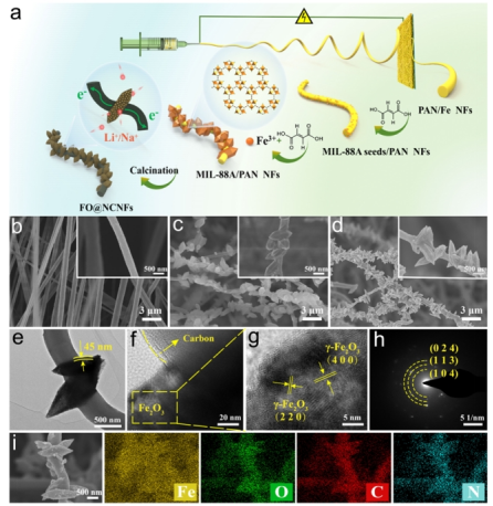 近期,江南大学乔辉教授和魏取福教授团队在Advanced Fiber Materials上发表了题为“Growth-Controllable Spindle Chain Heterostructural Anodes Based on MIL-88A for Enhanced Lithium/Sodium Storage”的研究进展。研究者通过静电纺丝技术和种子介导生长策略,在水溶液中配位Fe3+和富马酸,构建了一种纺锤链结构金属有机框架(MIL-88A)自牺牲模板,这是一种环境友好的合成路径。研究结果表明,种子介导生长策略可以将成核和生长阶段相分离,从而更好地控制MIL-88A的形状演变,提升面质量负载量。得益于其杂原子掺杂导电网络、多孔结构和多组分协同效应,纺锤链结构Fe2O3@N掺杂碳纳米纤维(FO@NCNFs)应用于锂离子电池和钠离子电池显示出良好的倍率性能和长循环稳定性。