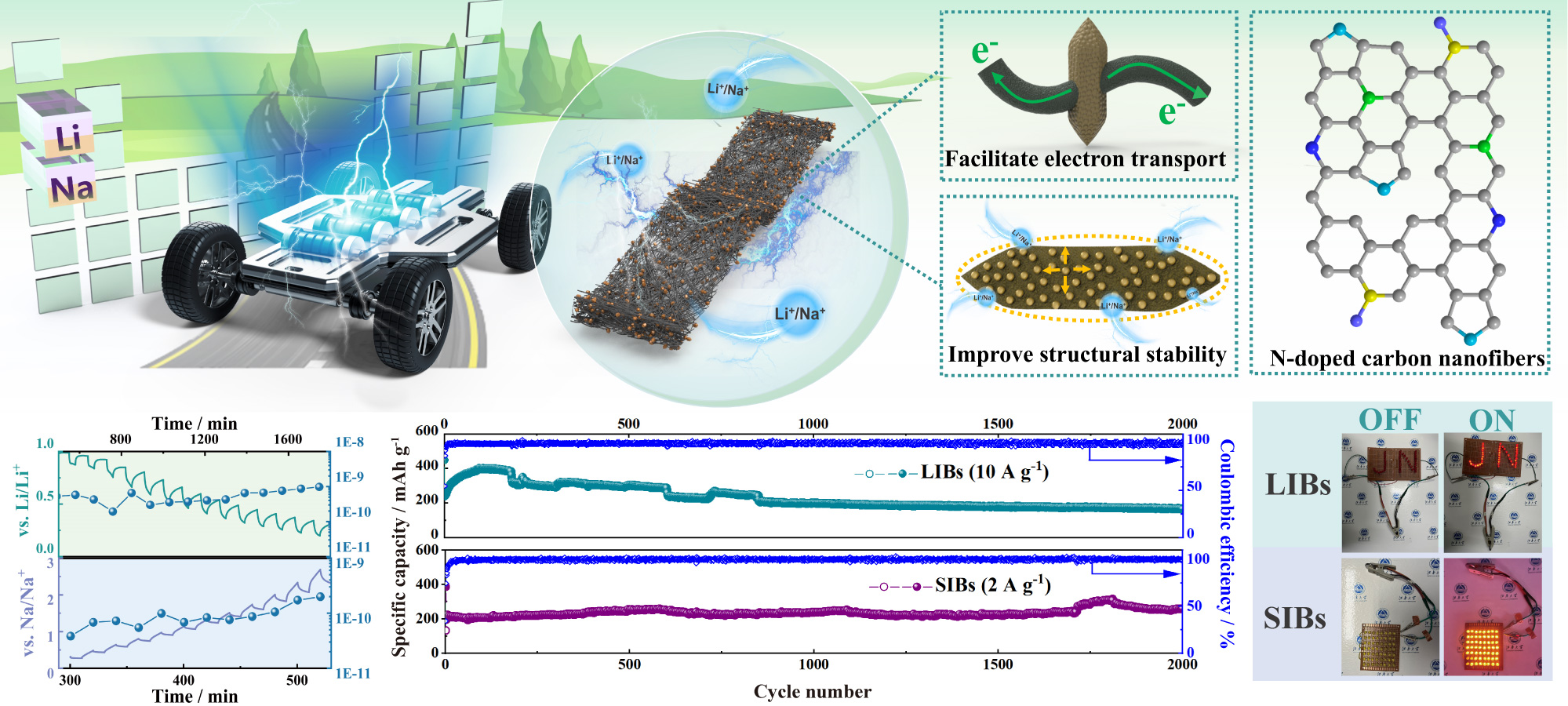 此外,制备的全电池FO@NCNFs-6//LiCoO2和FO@NCNFs-6//Na3V2(PO4)3可至少点亮45个LED灯泡组成的灯牌,显示出实际应用前景。因此,这种从纳米尺度到宏观尺度调控的纺锤链结构,将为高能密度与功率密度纤维电极材料的制备及其在下一代可充电电池中的应用提供新的视角。