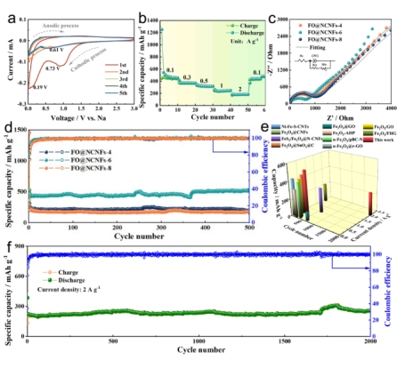 图3:纺锤链状FO@NCNFs复合纳米纤维应用于钠离子电池的电化学性能