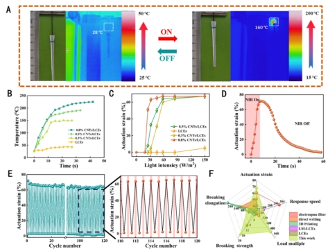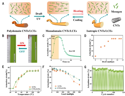 近年来,智能材料因其具有传感、信息识别、快速响应、自愈和自适应等特征而受到广泛关注。将环境刺激转化为机械功的致动器被广泛应用于智能驱动、软机器人和人工肌肉等领域。作为一类新型的智能材料,液晶弹性体(LCEs)是一种轻交联的聚合物网络,它结合了液晶的自组织特性和响应性与聚合物橡胶的熵弹性,具有独特的可逆形变特性。然而,制备具有高驱动率和快速响应的液晶弹性体复合智能材料仍是一项巨大的挑战。