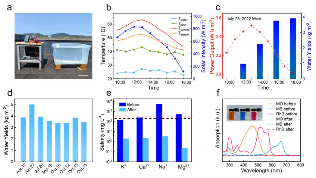 图4.装置实际应用性能测试。a-d,户外实际性能测试图,一天的室外光强温度变化,水电联产数据和稳定性测试。e-f,处理海水/染液性能对比;