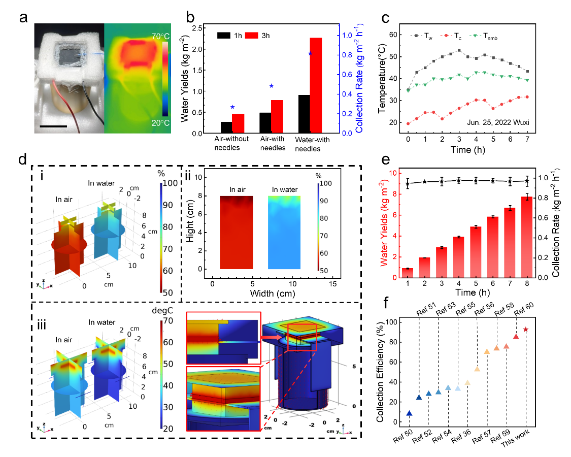 图3.水蒸发装置冷凝性能优化。a.装置测试图。b-e.不同的装置结构设计其蒸汽收集性能,软件模拟分析冷凝效果,冷凝效果的稳定性测试。f.蒸汽收集效率与现有文献的对比。
