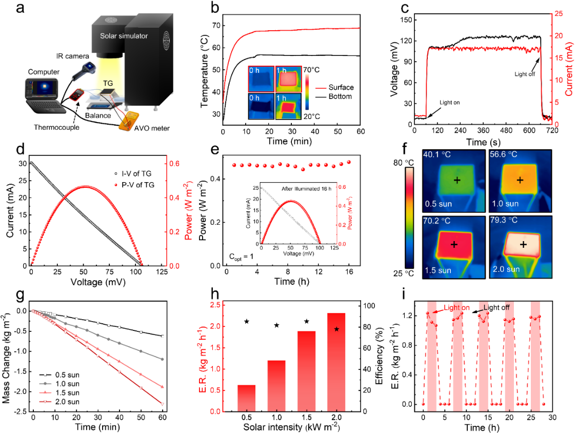 图2.无冷凝器的水蒸发组件的性能表征。a.装置测试图。b-e.温差发电片上下表面温差及相关发电数据。f-i.水蒸发组件表面温度热成像图、水蒸发速率和蒸发稳定性测试图。
