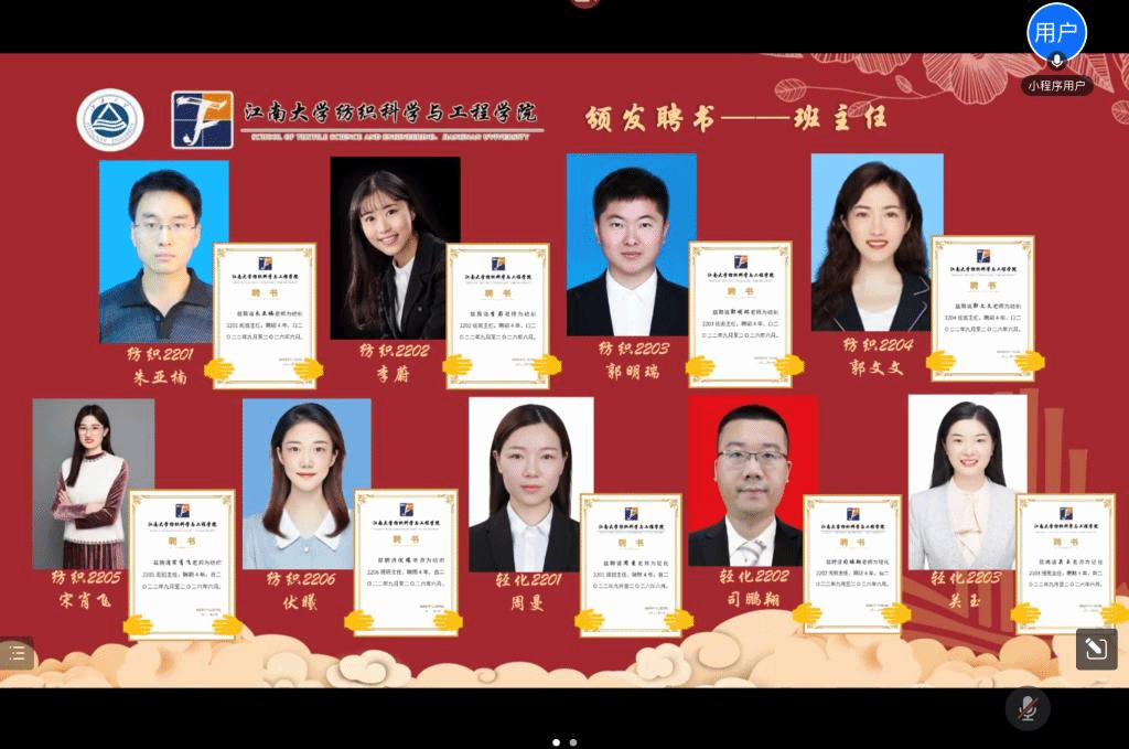 会上,陈艳君宣读了《江南大学纺织科学与工程学院2022级新生班主任聘任名单》,张菁为朱亚楠等9位班主任和王梦竹等9位副班主任线上一键颁发聘书。