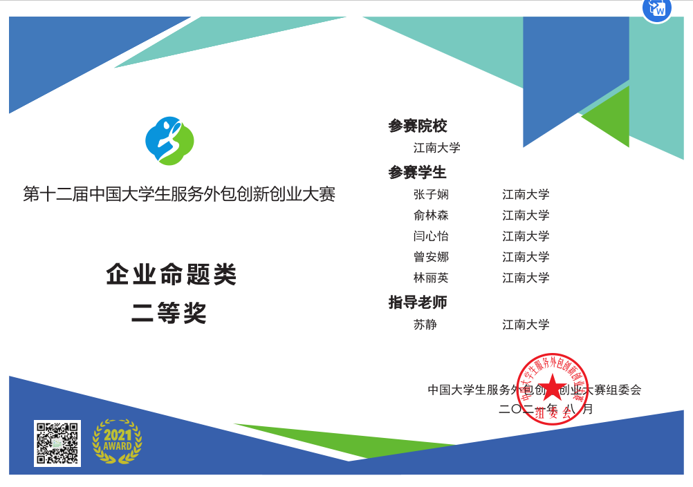 近日,第十二届中国大学生服务外包创新创业大赛在江苏省无锡市落幕。经过激烈角逐,由我院苏静老师指导,纺织1801班张子娴同学负责的科创作品《小微企业跨组织人才管理系统》(参赛学生:张子娴、俞林森、闫心怡、曾安娜、林丽英)荣获全国二等奖。