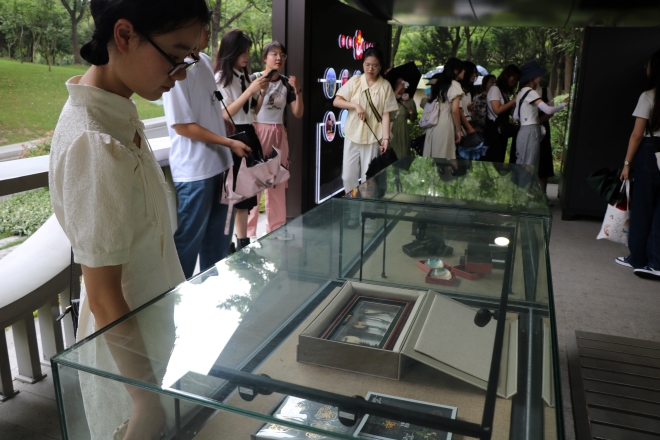 金匮公园是江苏省首个汇聚“六区十八景”的党建主题公园,旨在打造“有内涵、有颜值、有温度,现代化、智能化、共享化”的红色记忆打卡点,努力建设成为全国一流的公园式、开放式党群服务中心。值得一提的是,公园内特别设置了8个初心驿站,分别展示8个市(县)区党建引领高质量发展的成果。在游览过程中,蔡老师结合自身经历,详细为我们讲解了无锡本地的党政建设成果、历史文化背景和社会发展状况,介绍了中国共产党和无锡人民几十年来的峥嵘岁月和奋斗历程,让同学们在观光的同时汲取奋进力量,收获精神补给。