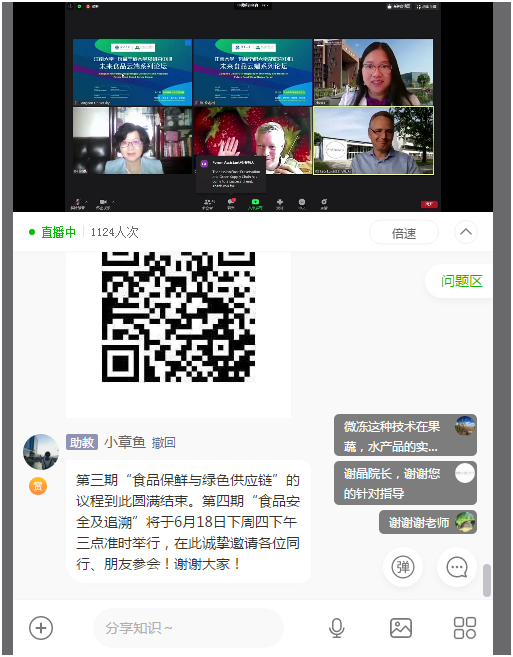 2020年6月11日,“江南大学-瓦赫宁根大学及研究中心未来食品云端系列论坛”第三期会议举行并取得圆满成功。通过总结与探索前两期论坛的经验与不足,本期会议的举办逐渐走向成熟化与系统化,成功吸引了来自国内外1300多名专家、学者和同行等听众的积极参与。本次会议围绕“食品保鲜与绿色供应链”这一极具特色与前沿的话题展开研讨。出席本次会议的嘉宾主要有荷兰瓦赫宁根大学及研究中心JanVerschoor研究员、LeoLukasse研究员以及浙江大学孙崇德教授和上海海洋大学谢晶教授。本次会议由瓦赫宁根大学及研究中心-食品生物研究院及培训学院中国项目发展经理刘珍博士主持。