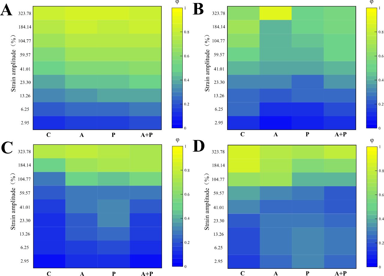 图9 挤出物在30℃(A)、加热至140℃(B)、冷却至100℃(C)和冷却至30℃(D)时耗散比图