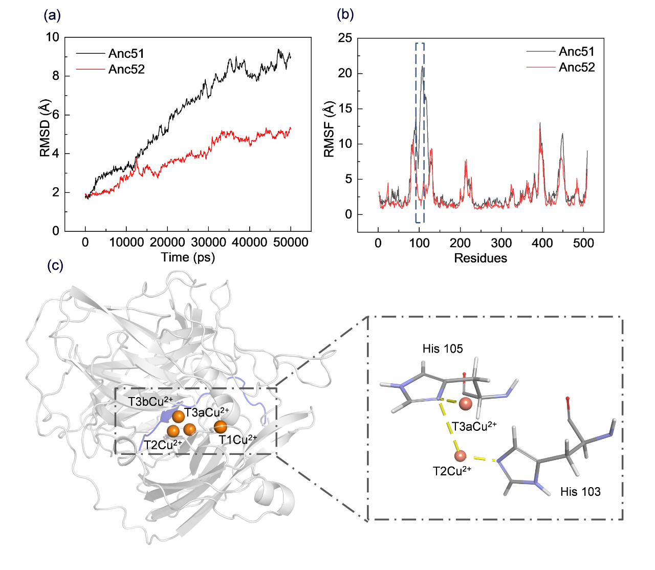 在本研究中,通过祖先序列重建从23个细菌三域漆酶序列中生成并鉴定了9个祖先漆酶。除祖先漆酶Anc41外,其它祖先漆酶均能在60°C(pH 3.0或pH 7.0)降解低密度聚乙烯(LDPE)塑料,且无需对塑料进行预处理(加热、UV照射)和添加反应介体。其中,祖先漆酶Anc52在70°C和pH 7.0降解LDPE的效果最好。序列分析显示,Anc52与已报道可降解PE的漆酶具有较低的序列一致性(18%-41.7%)。为了进一步提高PE降解效率,Anc52(0.2 mg/mL)在90°C下催化反应14 h,PE塑料表面产生了更明显的褶皱和凹陷,其羰基和羟基指数分别达到2.08和2.05。随后,通过定点突变确定了Anc52对PE塑料降解效率至关重要的氨基酸残基S203和R288。分子动力学分析表明,氨基酸残基S203和R288可能参与了该酶催化活中心三铜簇的稳定化。此外,研究还发现在pH为7.0进热处理(70°C和90°C),Anc52具有明显的热激活现象;热激活后的Anc52具有较高的催化效率(kcat/Km= 191.73mM-1·s-1)和热稳定性(70°C时的半衰期为13.70 h)。综上所述,本研究通过祖先序列重建获得了具有明显的PE塑料降解能力祖先漆酶。