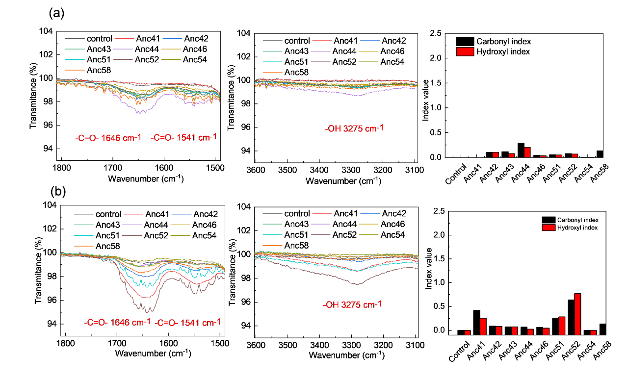 图1 在不同pH条件下,祖先漆酶处理的LDPE塑料FTIR光谱分析