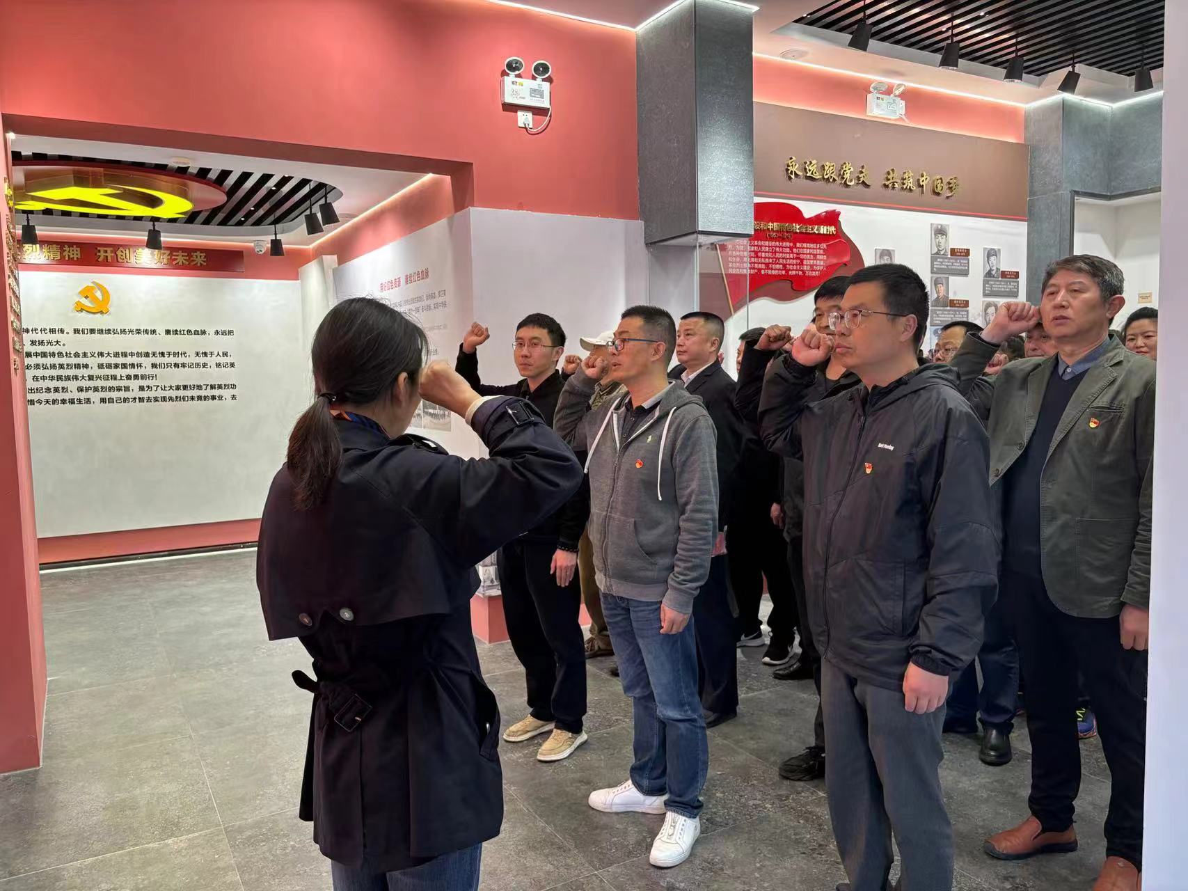 陈列馆鲜红的党旗前,会议中心党支部书记金明媚带领全体党员紧握右拳,以铿锵有力之声重温入党誓词,一字一句,神圣而豪迈。回顾入党时的庄严承诺,坚定每位党员的理想信念,践行初心使命。