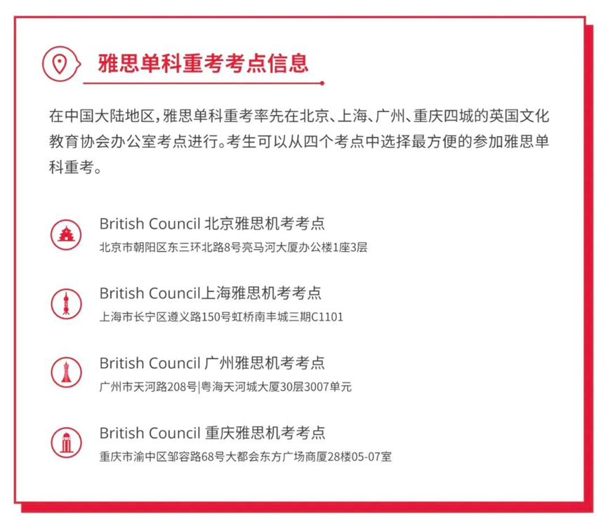 即将开放的中国大陆雅思机考单科重考考点信息如下:
