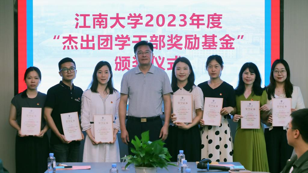 此外,会议进行了2023年度“江南大学杰出团学干部奖”颁奖仪式。校团委书记魏珍吉宣读了《关于2023年度“江南大学杰出团学干部奖”的表彰决定》,吴雨琛、陈裕、孟召双、王园园、胡晓丹、许金红、王牧等七名教师及陈昱瑶、姜佳慧、唐承宇、广茂池、郭行健、孟卓等六名学生获评。符惠明、王斌为获奖师生颁发了荣誉证书。社会合作与校友联络处处长周云龙为江苏新思域教育科技集团有限公司颁发捐赠证书。