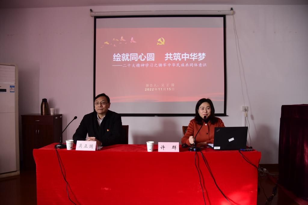 11月15日上午,在离退休人员活动中心一楼大会议室,副校长吴正国为老同志作《绘就同心圆 共筑中华梦——二十大精神学习之铸牢中华民族共同体意识》专题培训。培训会线上线下同时进行,离退休党工委委员、党支部、关工委、老科协、老体协等骨干及离退休工作党支部全体党员近百人现场参会,其他老同志线上参会。会议由离退休党工委书记、离退休工作处处长许群主持。