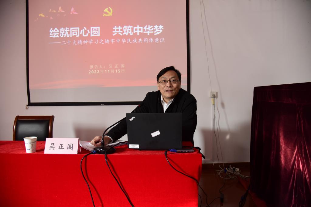 吴正国首先领学了党的二十大精神概览,他从大会的意义与主题、报告的主要内容、过去五年工作、十年三件大事、中国式现代化的中国特色、中国式现代化的本质要求、总的战略安排等方面作了阐释。接下来吴正国解读了铸牢中华民族共同体意识,对中华民族共同体意识理论提出、基本内涵、促进各民族深度交往交流交融作了分析和解释。最后他就边疆治理与党的治藏方略作了分享。吴校长的讲座内容生动,观点精准到位,他结合个人三年的援藏经历,用具体的案例和数据,以及个人的体验感受,让我们深刻的感受到党坚持把马克思主义关于边疆治理的科学理论和马克思主义民族理论与具体实际相结合,不断促进各民族的平等团结和繁荣发展,始终同人民同呼吸、共命运、心连心,不断巩固全国各族人民大团结,形成同心共圆中国梦的强大合力。
