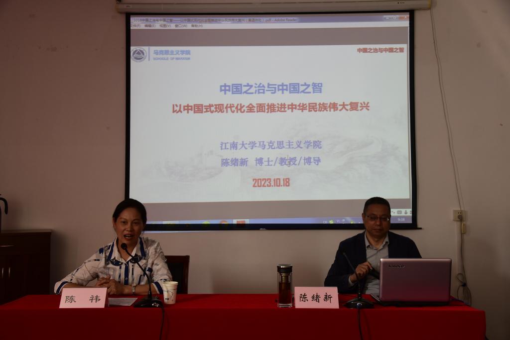 2023年10月18日上午,在离退休人员活动中心一楼大会议室,离退休党工委邀请马克思主义学院陈绪新教授作《中国之治与中国之智——以中国式现代化全面推进中华民族伟大复兴》专题学习培训。离退休党工委委员、党支部书记与支部委员、特邀党建组织员等近百位老同志参加了培训。会议由离退休党工委副书记陈祎主持。
