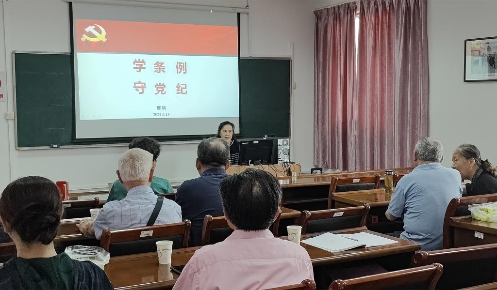 曹瑛传达了学校关于党纪学习教育的相关要求和离退休党工委支部书记培训会议有关精神,阐释了《中国共产党纪律处分条例》(下称《条例》)修订的重要意义和主旨要义,解读了“六项纪律”负面清单,重点讲解了涉及离退休干部的相关规定,并就如何贯彻落实《条例》提出建议。她强调,离退休党员干部要深刻认识开展党纪学习教育的重大意义,学深悟透《条例》的主旨要义和规定要求,自觉学纪、知纪、明纪、守纪,把遵规守纪内化于心、外化于行,用实际行动维护好离退休干部党员形象,始终做到忠诚干净担当。