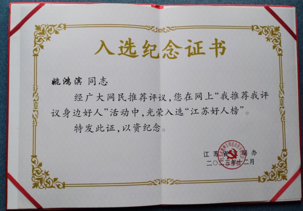 日前,中国科协办公厅公布了2023年度科技志愿服务先进典型,我校退休教师、校老科协会员姚鸿滨获得了“最美科技志愿者”荣誉(江苏省唯一)。与此同时,在江苏省文明办发布的2023年第四季度“江苏好人榜”中,他还光荣入选了助人为乐类“江苏好人”。