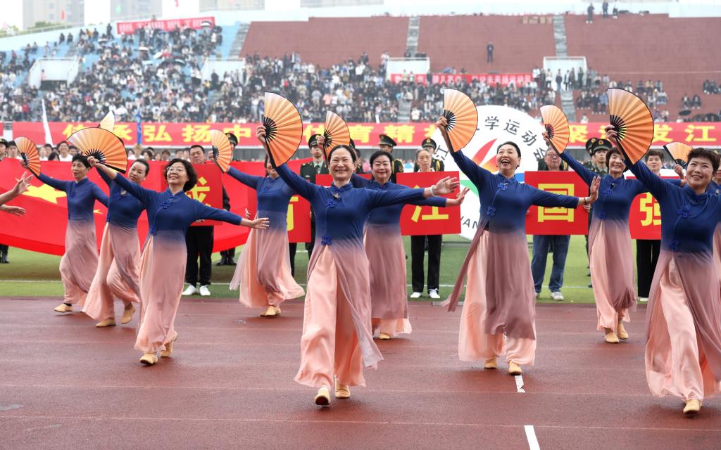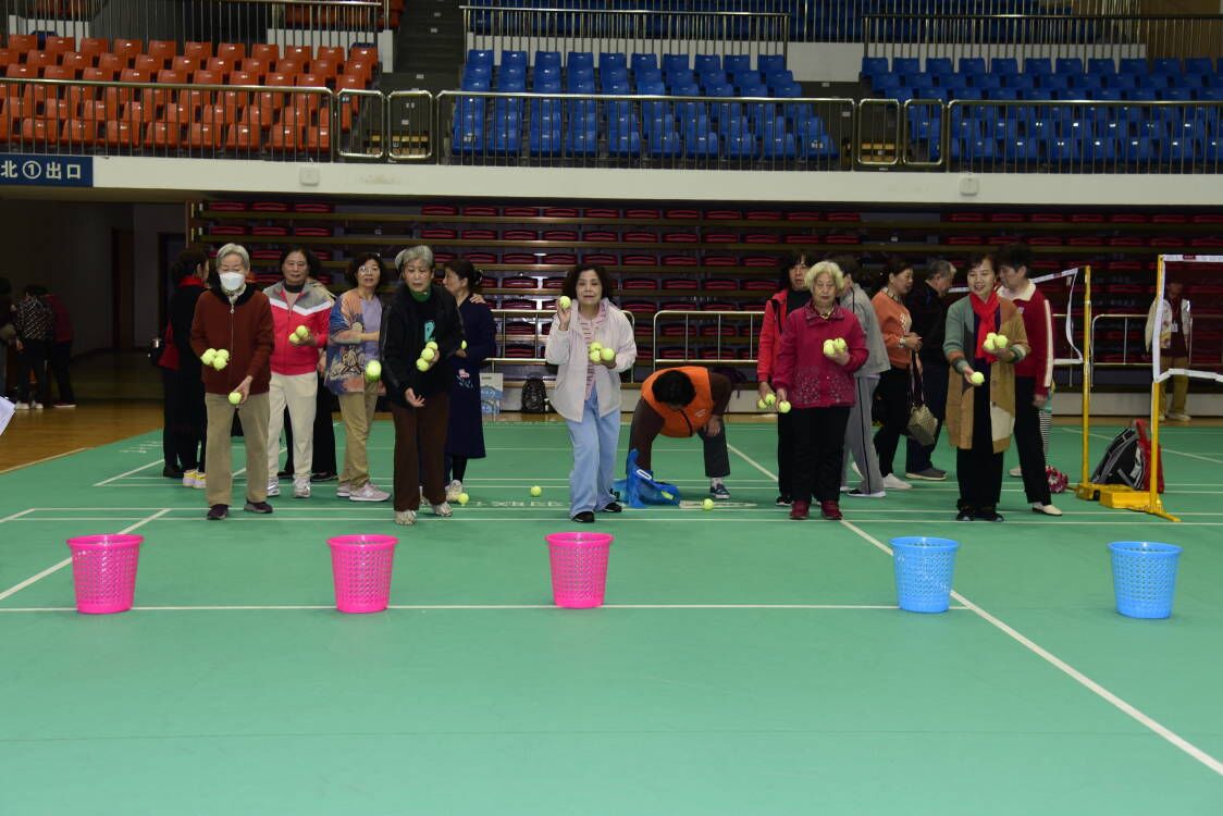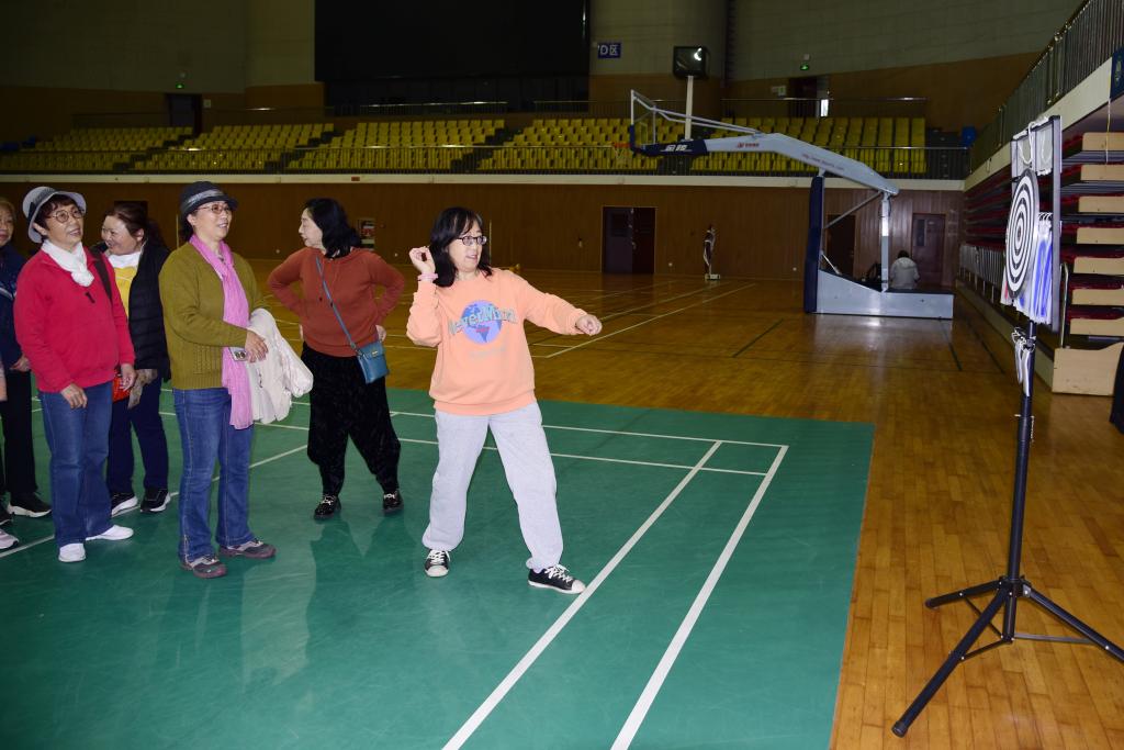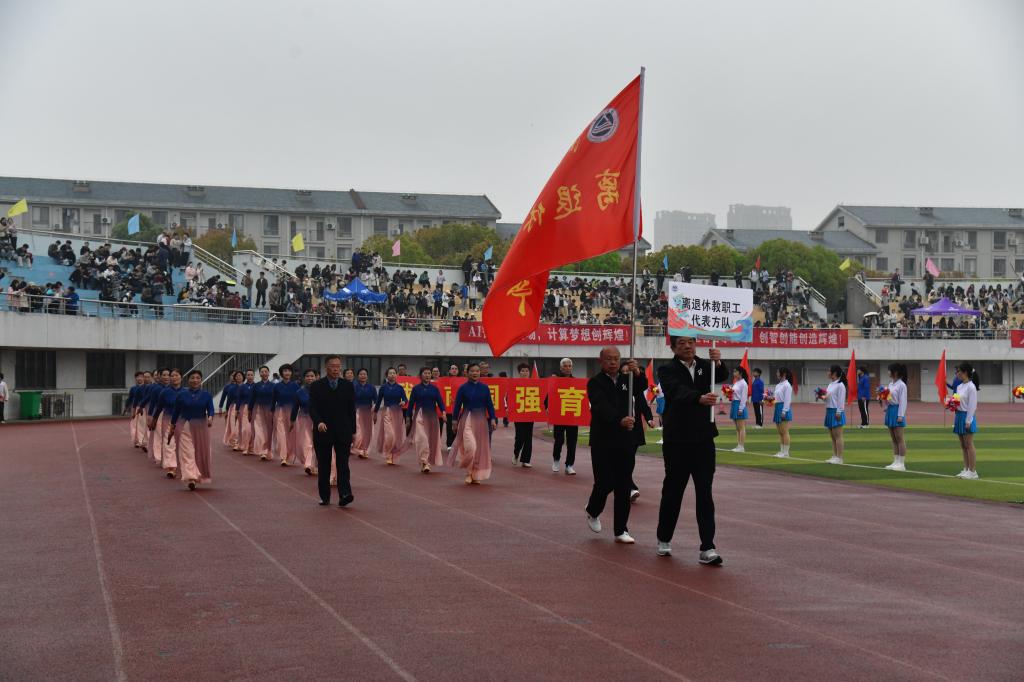 开幕式上,当由原江南大学校长陶文沂高举离退休教工代表队大旗引领的方队上场时,观礼台上各位领导纷纷起立并报以热烈掌声。方队由三列身穿上深下浅渐变色长裙的老体协舞蹈队队员,一列由八位手持标语牌的男女队员组成,大家迈着整齐的步伐走来,齐声喊着“老有所为、老有所乐”“教育强国、江南有我” 的口号,表达了他们将继续为学校和社会贡献力量的心声。随着《上春山》音乐的响起,舞蹈队员们踏着轻松的节拍,跳起欢快的扇子舞,优美动作中蕴含着线条美和力量美,让人心情愉悦,神清气爽,全场再次报以热烈掌声和欢呼声。开幕式后,进行了教工丙组的趣味运动比赛,70余位退休教职工在体育馆征战篮球碰瓶、钓鱼、网球投篓和飞镖等4个项目,他们在活动中收获了欢乐、健康和友谊。