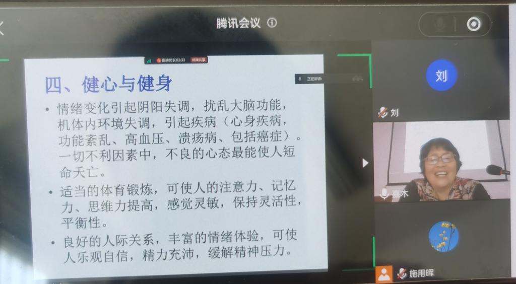 5月29日,食品生化医药分会在青山湾离退休教工活动中心举办了主题为《健心才能健身》的线上线下讲座,由市老科协科普专家单平讲解健心对于个人健康的重要意义,如何有效健心等等。讲座后,单平就大家关心的健康问题进行了答疑。