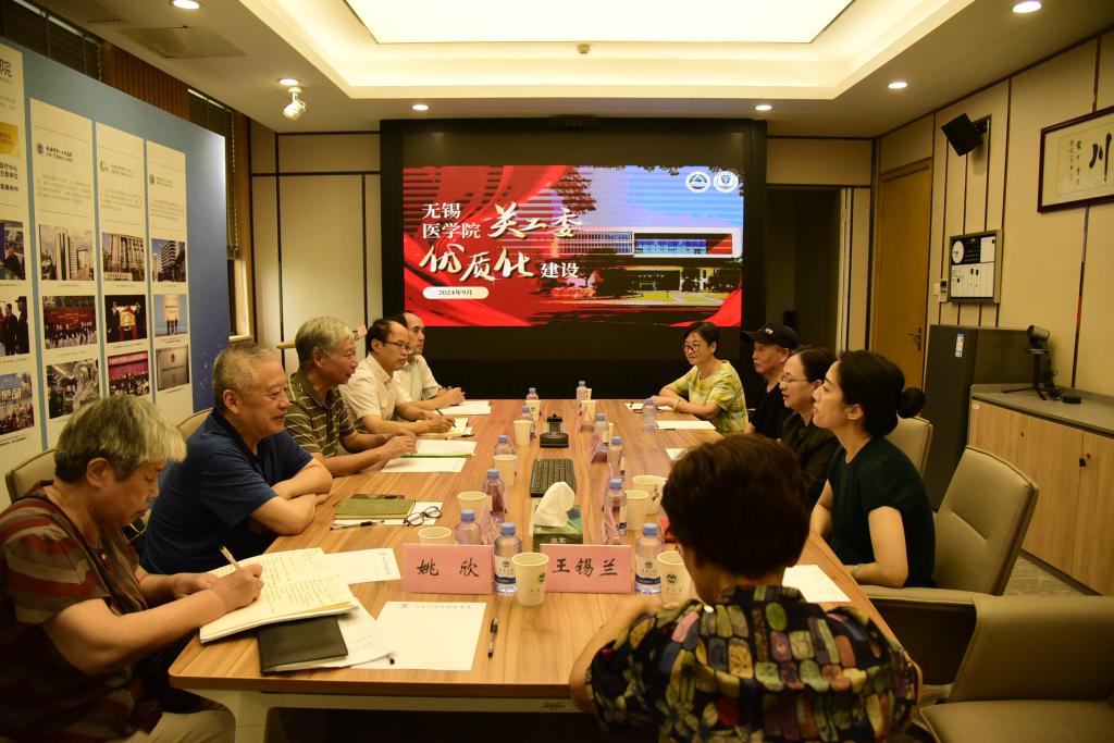 在无锡医学院,党委副书记包羽从党建带关建紧抓组织建设、统一思想认识优化队伍结构、丰富主题教育开展系列活动、牢扣学科特色树立文化品牌、加强条件保障等五个方面介绍了学院关工委优质化建设情况,针对薄弱环节,提出将精准对标、争先创优、持续发力,提升工作质量与水平。学院党委书记向琪、关工委常务副主任吴骥一、王锡兰(附院),以及王永南、陈敏娟等关工委老同志参加了会议。娄国栋在讲话中对无锡医学院关工委工作给予充分肯定,在学院党委的领导下,党建带关建、关建带育人,工作有优势、有突破、有提升,特色亮点成效显著。向琪在讲话中表示,将以校关工委来院调研指导为契机,进一步打好工作基础,优化关工委工作常效机制,创新关工委工作品牌,更好发挥校企、校医、校社等党建平台优势作用,彰显关工委工作成效。