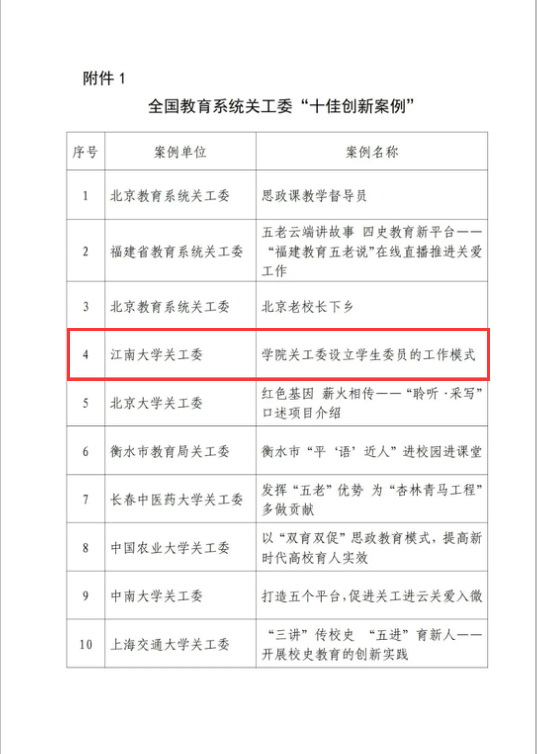 近日,教育部关工委《关于2021年全国教育系统关工委创新案例评选结果的通报》(教关委函〔2021〕13号)文件公布了全国教育系统关工委创新案例评审结果,江南大学关工委申报的《学院关工委设立学生委员的工作模式》荣获全国教育系统关工委“十佳创新案例”奖,其中高校获奖六项,地方教育系统获奖四项。