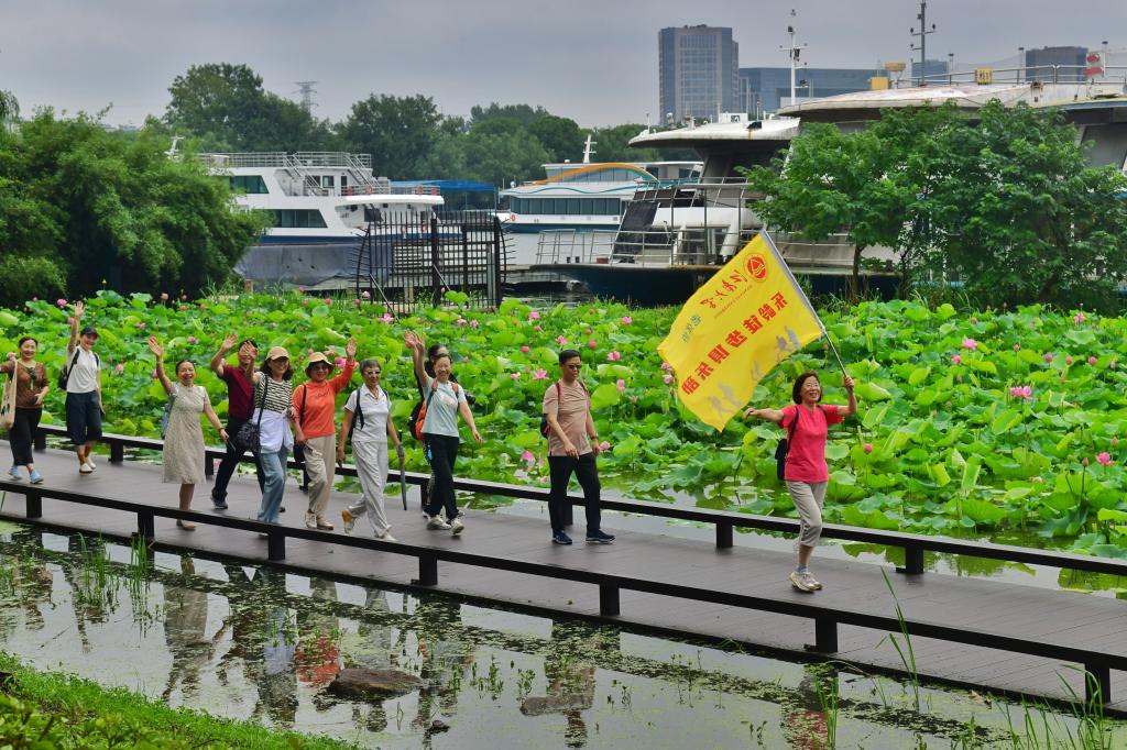 徒步从梅园出发,经栖园、管社山庄,大家行进在赏荷栈道上,沿途欣赏着烟雨江南的荷塘美景,感受“接天莲叶无穷碧”的意境,品味荷花“出污泥而不染”的圣洁,时而驻足拍照,一路欢声笑语,共同感受徒步带来的轻松和愉悦,每个人脸上都洋溢着幸福欢快的笑容。