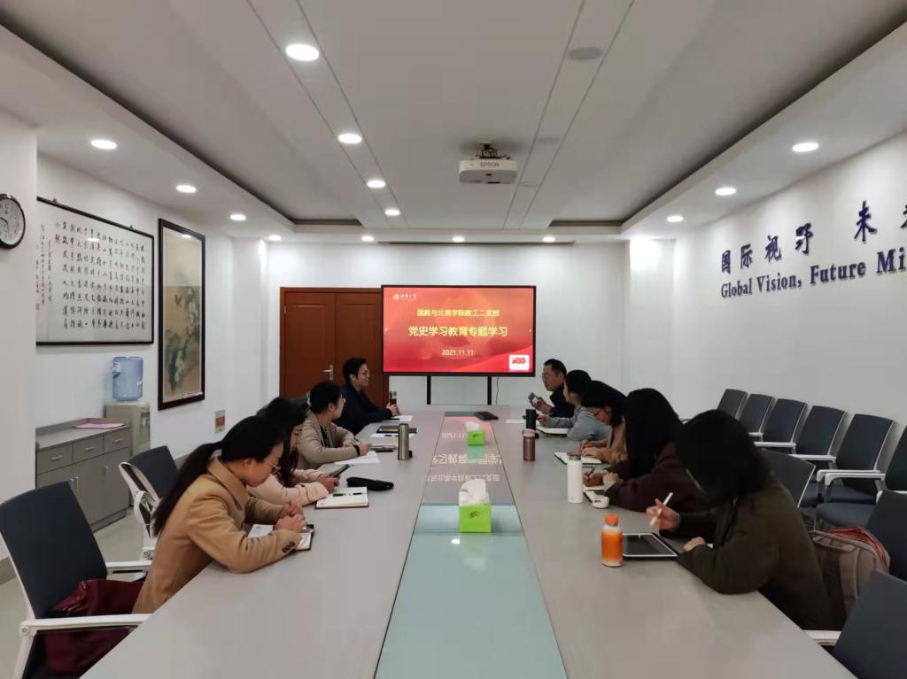 为进一步推进党史学习教育,在学“党史”中汲取精神力量、坚定理想信念,2021年11月11日下午,国际教育学院与北美学院教工二支部在学院306会议室展开了“我做党史讲述人”专题党课之“革命歌声魂系百年党史” 为主题的党史学习教育,同时开展收看党的十九届六中全会报道的学习研讨。支部书记王利峰主持会议。