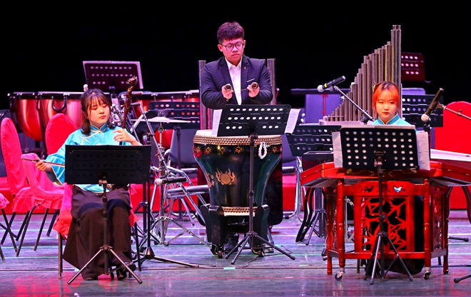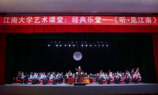 12月22日晚,江南大学“艺术课堂”之经典乐堂“听·见江南”在我校文浩馆观众厅成功举办。音乐会由江南大学“山水清音”民乐团与无锡市民族乐团合作演奏,人文学院音乐系教授沈雷强担任指挥,特邀人文学院副教授李恩忠、设计学院2018级本科生郑仁政共同呈现这一场艺术盛宴。