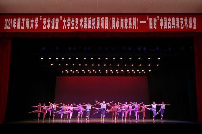 6月23日晚,江南大学“艺术课堂”大学生素质拓展项目(同心向党系列)——“四时”中国古典舞艺术课堂在文浩馆顺利举行。本次艺术课堂由江南大学党委宣传部主办,江南大学人文学院、国家大学生文化素质教育基地承办,由冯程程、臧彦杰两位党员教师组织、编排。本场课堂,以江南大学中国古典舞系列课程为依托,以讲述人的身份带领大家走入中国古典舞蹈文化之旅。