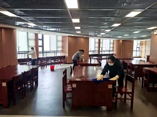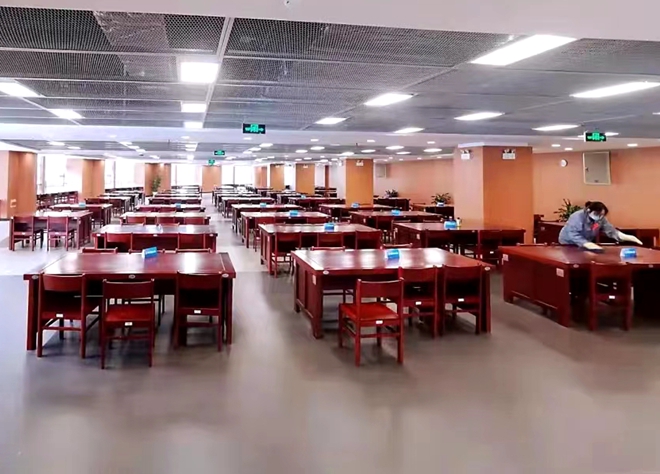 为了给同学们一个安心的阅读学习环境,早在凌晨五点,工作人员就背起喷雾器,将稀释后的84消毒液喷洒在走道、卫生间、门窗。从一楼开始,他们用浸泡过泡腾消毒片的毛巾擦拭桌椅,不放过任何角落。这样的消杀工作早晚一次,淡淡的消毒水味道令人安心。
