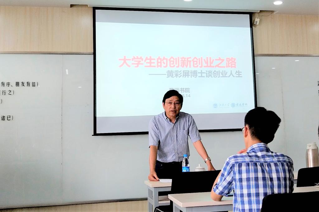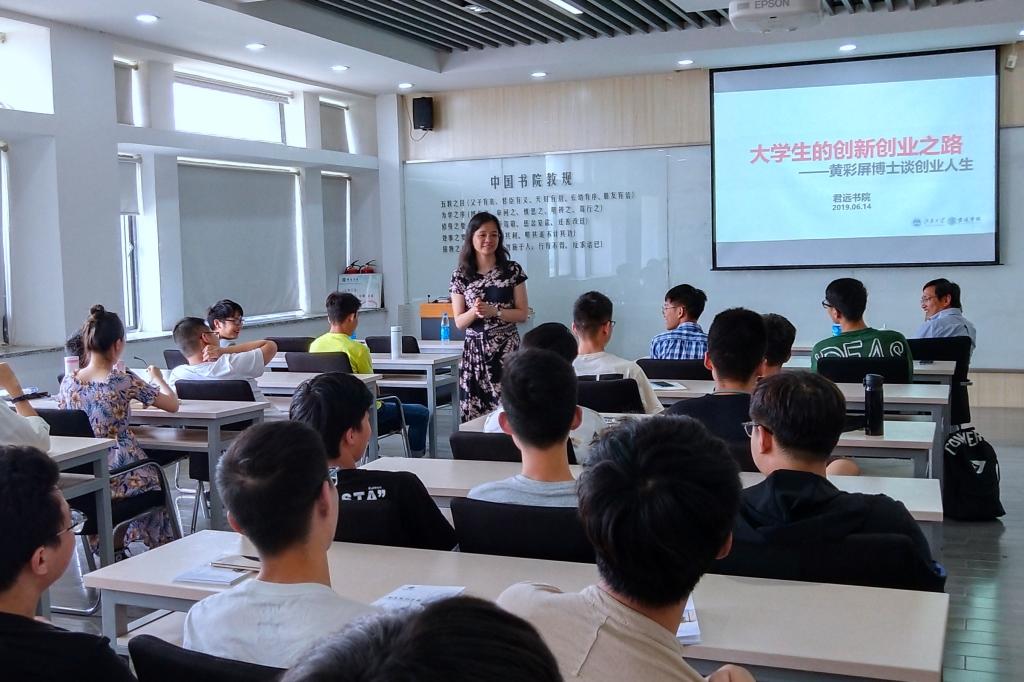 6月14日下午,香港领先创新顾问有限公司与领先创新科技有限公司CEO和创始人黄彩屏博士做客君远书院2019年第4期“名家讲坛”,在机械楼E504为我校学生做了题为“大学生的创新创业之路”的报告。讲坛由君远书院院长黄正明主持。