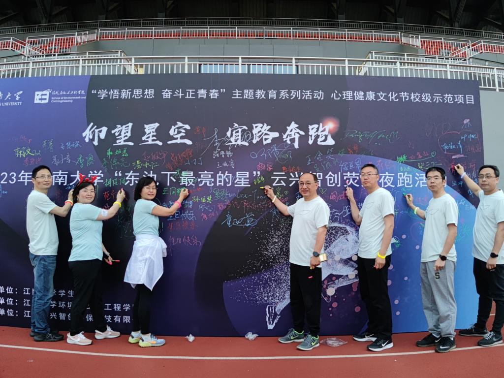 5月18日晚上,“学悟新思想 奋斗正青春”主题教育系列动、心理健康文化节校级示范项目“仰望星空,宜路奔跑”2023年江南大学“东氿下最亮的星”云兴智创荧光夜跑活动圆满举行。江苏云兴智创环保科技有限公司执行董事屠平,江苏云兴智创环保科技有限公司总经理周田园,宜兴绿色低碳协会秘书长汤水江,江南大学宜兴研究生院管理办公室主任杨延,环境与土木工程学院党委书记李艳、院长王震宇及学院党政领导班子参加此次荧光夜跑。