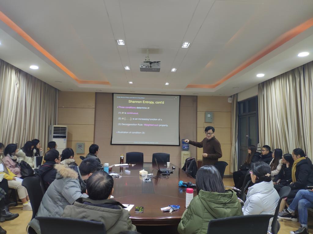 1月7日下午1点30分,Ding教授作了题为“熵,最大熵及最大熵方法”的学术报告,报告会由胡满峰副院长主持,数学专业教师以及慕名而来的相关专业老师、应用数学专业研究生、信计本科生出席了报告会。报告中丁教授引入了信息熵和波茨曼熵的概念,介绍捷恩斯的最大熵原则。然后将这个原则与有限元的思想结合,构造一个有限元最大熵方法,计算离散动力系统的不变密度函数。报告由浅入深,使得在场的师生们收获良多。在报告提问环节中,师生们互动频繁,气氛热烈。