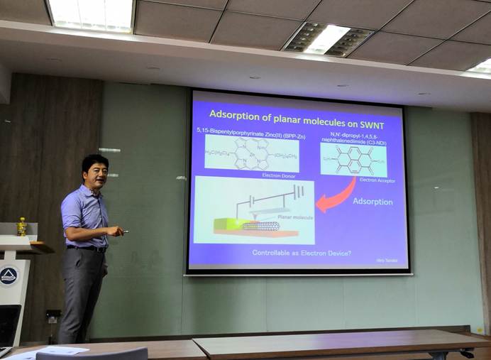 6月4日下午,日本九州工业大学田中啓文(Hirofumi Tanaka)教授应邀来我校进行学术交流并在化工楼A316学术报告厅作了一场题为“Electric Properties of Single-walled Carbon Nanotube and Nanoparticle Complex for Neuron-like Signal Generation”的精彩学术报告。