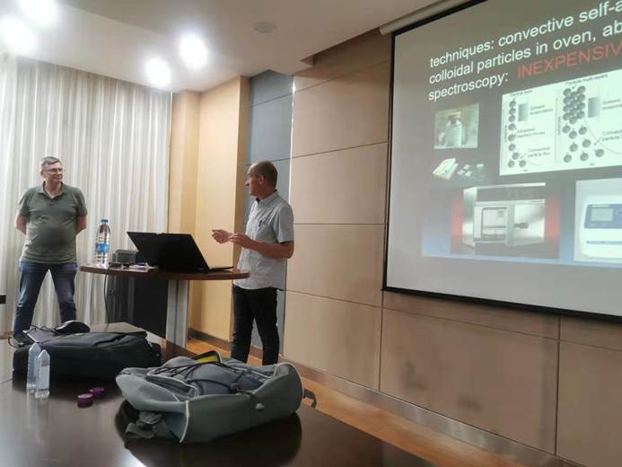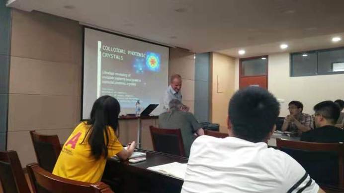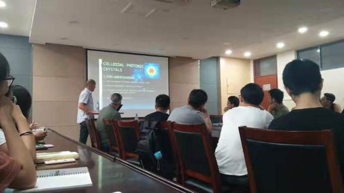 2019年9月10日下午,比利时天主教鲁汶大学化学系Koen Clays教授与澳大利亚国立大学Mark G. Humphrey教授来我校化工学院访问,并在化工学院A310开展了主题为“Colloidal photonic crystals”的讲座,化工学院张金方老师主持了这个讲座。讲座上Koen Clays教授与Mark G. Humphrey教授交流了胶体光子晶体的理论,胶状晶体材料随着空气湿度而变色以及通过缺陷设计改变胶体光子晶体的通频带的科学问题,讲座中Koen Clays教授将自己实验室自制的胶体片分发给化工学院的老师和同学,并且示范了变色的现象,Koen Clays教授与Mark G. Humphrey教授认真解答了化工学院老师和同学提出的问题。